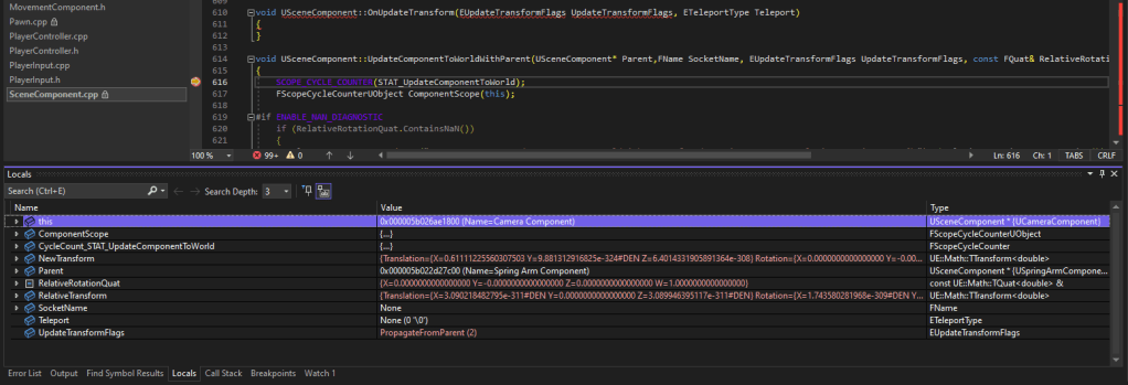 OK, it’s a camera component, but it would be helpful to know which actor it’s on. Again, one could browse down to the AActorComponent::OwnerPrivate field and then down to the ActorLabel field again. Or we can use natvis again: