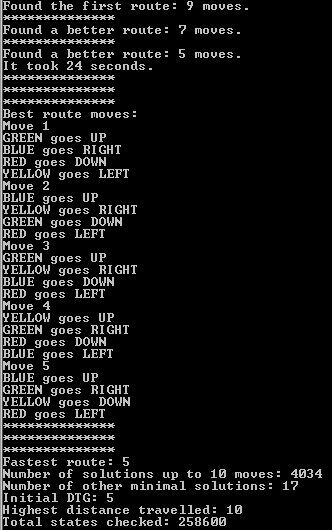 We chose to find all solutions up to move 10, rather than stop when a single fastest solution was found, so it took 24 seconds it total to solve the level. We find that the initial minimum distance of a red square to the red goal was 5, and that the fastest route was 5 moves. That is, there were no counter-intuitive, planning-type moves to make: it is possible to head directly to the goal. Already, this tells us the level is somewhat easier than other existing levels. Move instructions for an optimal solution are also printed.